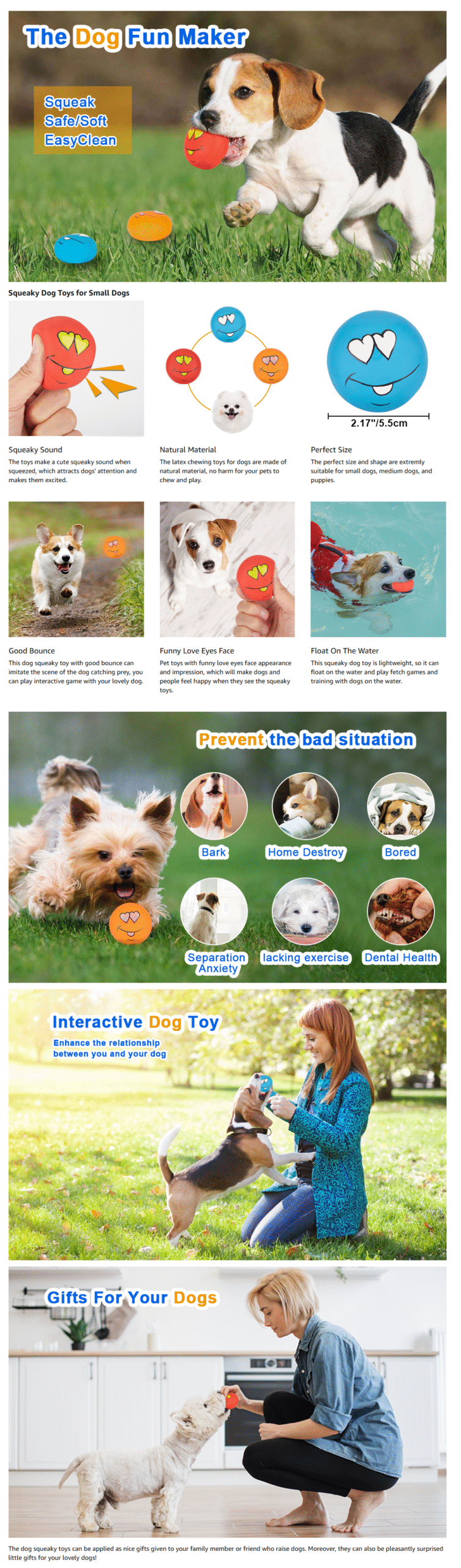 - 【Function of Squeaky Toys】 The design of our squeak balls is aimed at providing entertainment and stimulation, helping dogs chew and chase, while also helping to enhance their hearing. This type of toy can promote the physical and mental health of dogs, besides it can serve as a bridge for interaction between dogs and their owners, and owners can enhance their relationships by playing with their dogs.