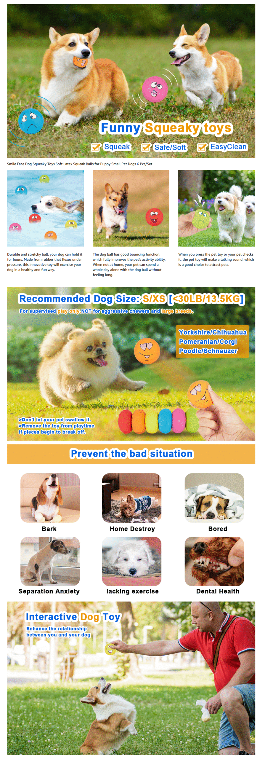 - 【Dog Toys Set with Smiley Face】 6 PCS toys with funny expressions to keep doggies entertained, no need to worry about toys lost under the couch. If you have any problem with your purchase, please feel free to contact us and we will reply asap.